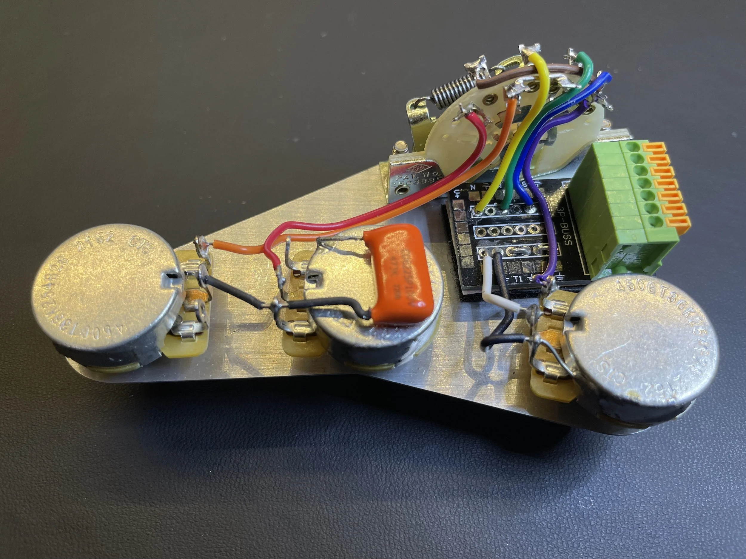 Made with 250K CTS pots, a .047uf Orange Drop tone capacitor and a 5-way CRL blade switch hand-wired to a purpose-built 3-pickup solderless terminal block mounted to an Emerson precision-cut ground plate. Includes prewired Switchcraft output jack.